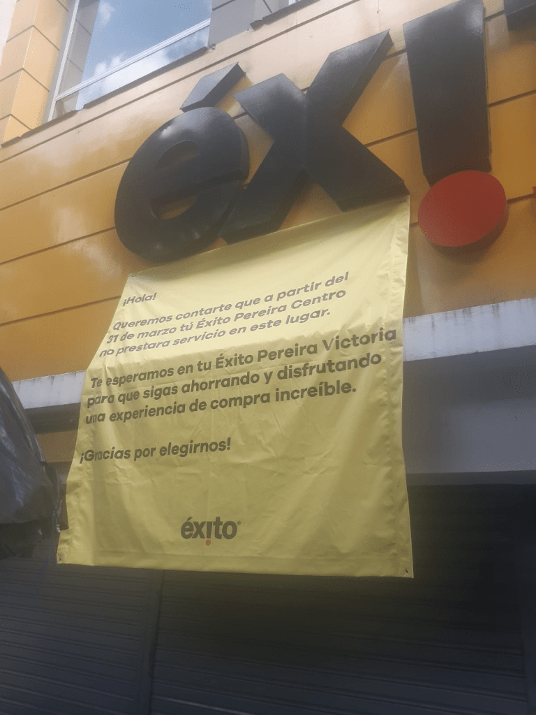 Un cartel, ubicado en su puerta central, anuncia la demoledora noticia del ÉXITO CENTRO e invita a su clientela a seguir comprando sus productos en tu ËXITO VICTORIA, “ para que sigas ahorrando y disfrutando una experiencia de compra increíble”.