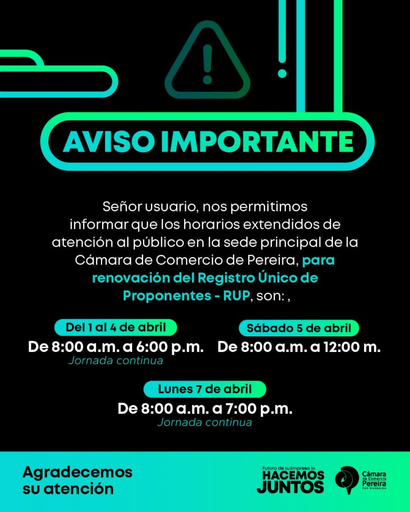 Extendemos nuestros horarios para la renovación del Registro Único de Proponentes -RUP – en nuestra sede principal de la Cámara de Comercio de Pereira.