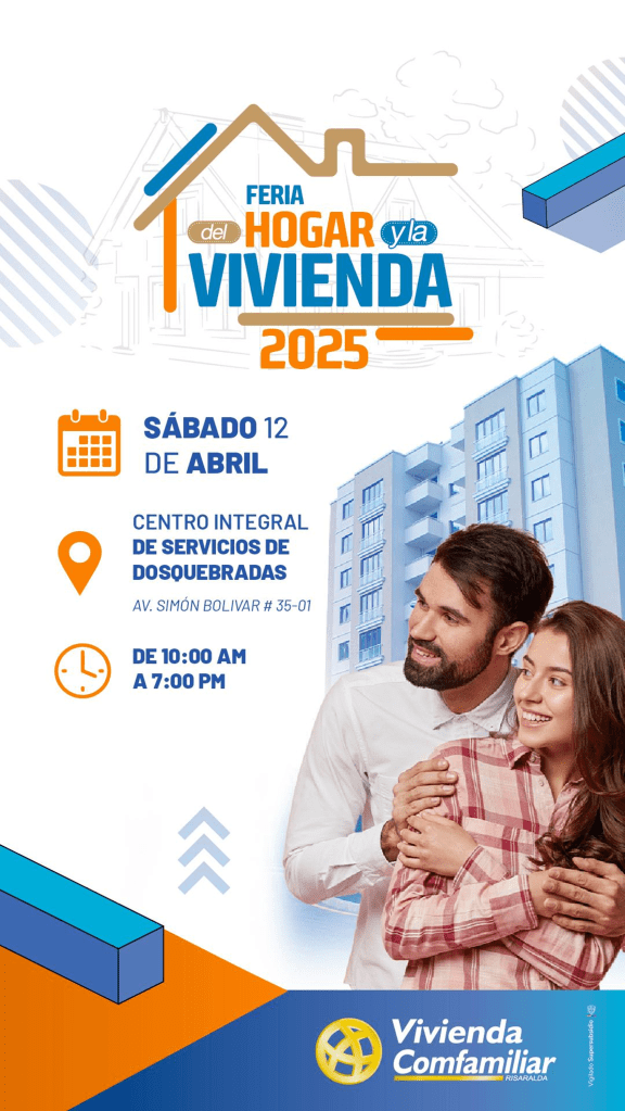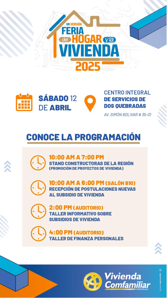 Desde el área de Vivienda de la Caja de Compensación, se llevará a cabo en el mes de abril la séptima versión de este evento, tanto afiliados como usuarios, podrán conocer los principales proyectos de vivienda que ofrecen algunas constructoras de la región (vivienda VIS o no VIS). Así mismo, podrán recibir asesoría en los servicios de Comfamiliar Risaralda, líneas de financiación y mucho más. Fecha: sábado 12 de abril Lugar: Centro Integral de Servicios Comfamiliar Dosquebradas (AV. Simón Bolívar #35-01) Hora: de 10:00 am a 7:00 pm