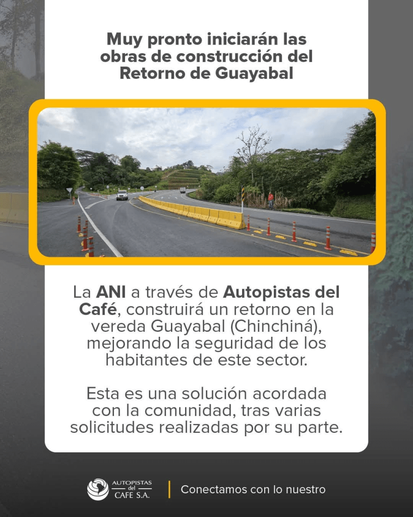 • Con una inversión de 408 millones de pesos, la ANI a través de Autopistas del Café construirá un retorno en la vereda Guayabal, mejorando la seguridad de los habitantes de este sector. Chinchiná, 24 de mayo del 2025.
