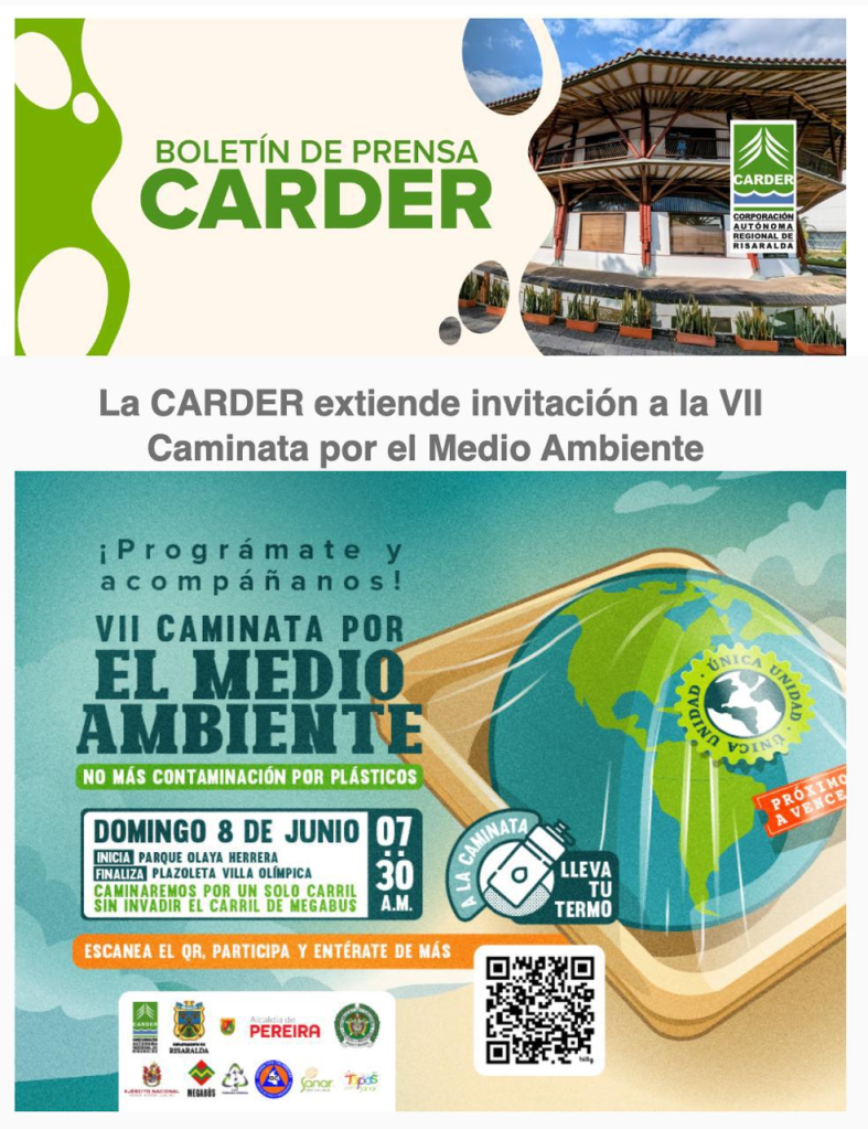 Este próximo domingo 8 de junio nos reuniremos por el medio ambiente, con un recorrido que iniciará a las 7:30 a. m. en el Parque Olaya Herrera en articulación con la vía activa y culminará en La Villa Olímpica de Pereira.