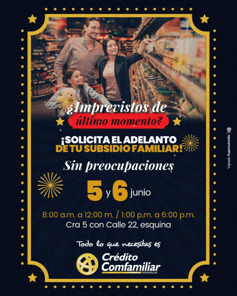 Este 5 y 6 de junio te esperamos en nuestra sede de Crédito, ubicado en la Cra 5 con Cll 22, para que puedas realizar el adelanto de tu subsidio familiar sin preocupaciones y utilizarlo en lo que tú y tu familia necesitan