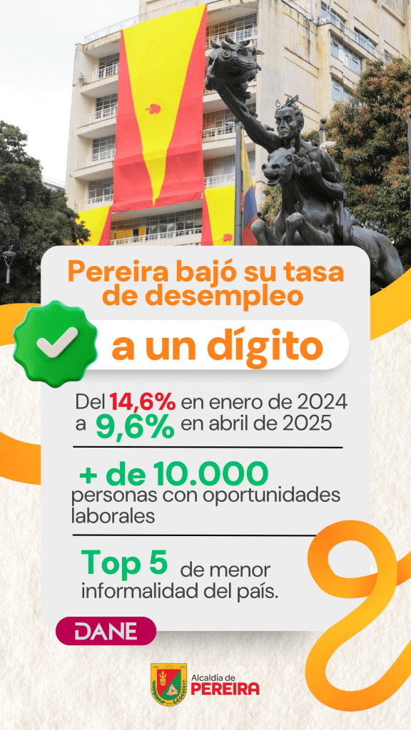 El Alcalde, Mauricio Salazar Peláez hizo eco en el consolidado nacional expedido por el DANE que redujo la tasa de desocupación a un s´polo digiti oen la capital del Risaralda. Esta se ubicó en un 9.6 por ciento y figura en el top 10 de ciudades con menos desocupación.