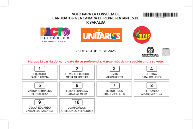 Por Risaralda, 10 personas inscritas aparecen en el tarjetón, en este orden y con el respectivo número Y representan hacia su interior, diversas organizaciones políticas.