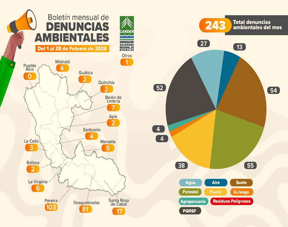 La Corporación Autónoma Regional de Risaralda, CARDER, presentó el balance mensual de denuncias ambientales correspondiente al periodo del 1 al 28 de febrero de 2026. Durante este mes, la autoridad ambiental atendió un total de 243 denuncias, evidenciando la participación activa de los risaraldenses en la protección del territorio.